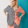 Make a statement with this striped pajama set featuring bold split-color stripes in vibrant Skeleton Candy hues. This short sleeve PJ set pairs a roomy button-down top with cropped sleep pants for year-round comfort. These breathable organic cotton PJs include pockets for nighttime essentials. Perfect for movie marathons or theatrical dreams.