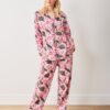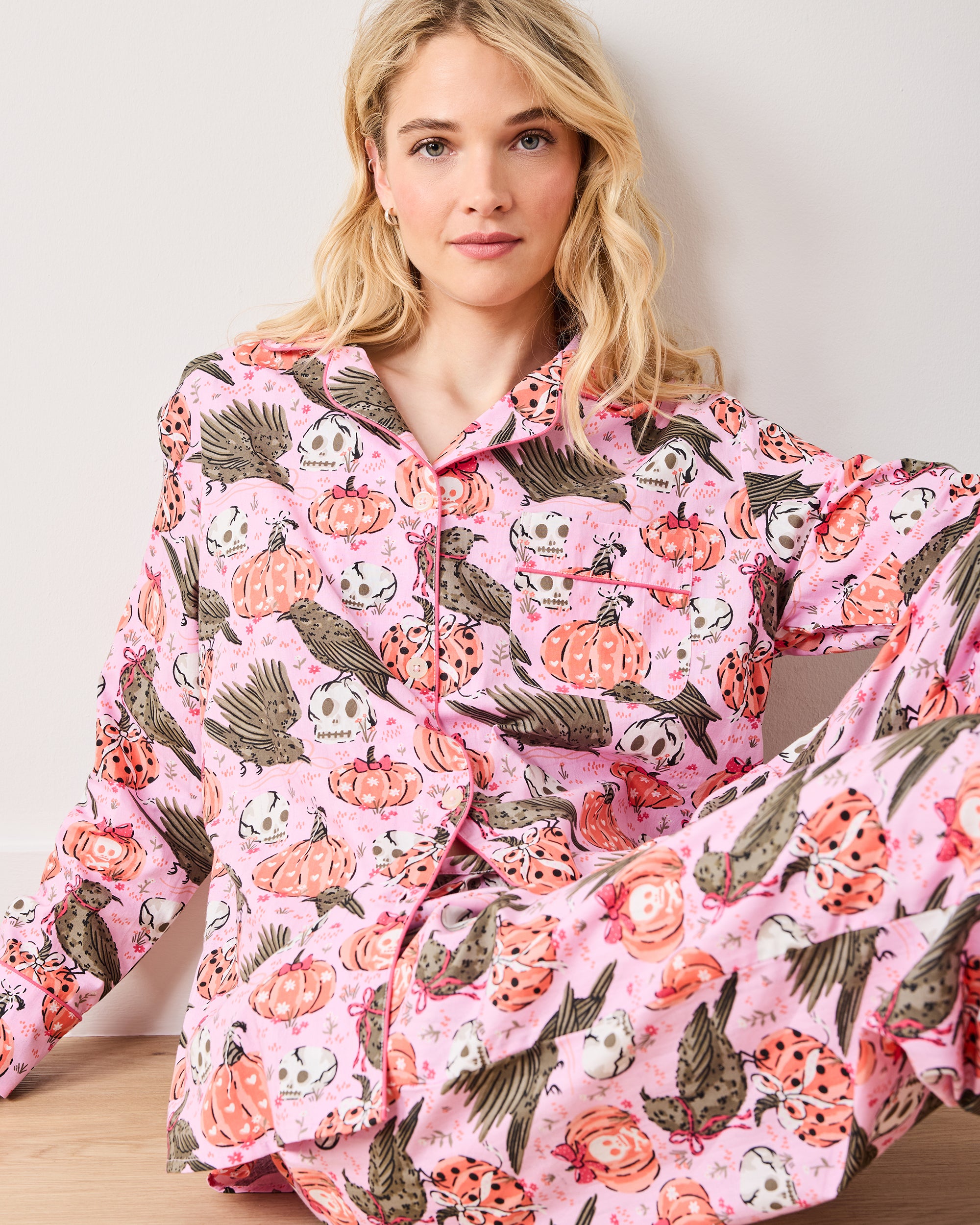Playful pumpkins, charming crows, and cute skulls dance across our Sleepy Hollow Halloween pajama set in soft pink. This cotton PJ set combines festive autumn motifs with breathable organic cotton for October nights that feel magical. This button-down sleepwear features a relaxed-fit top and comfortable pants with pockets, perfect for cozy evenings in.
