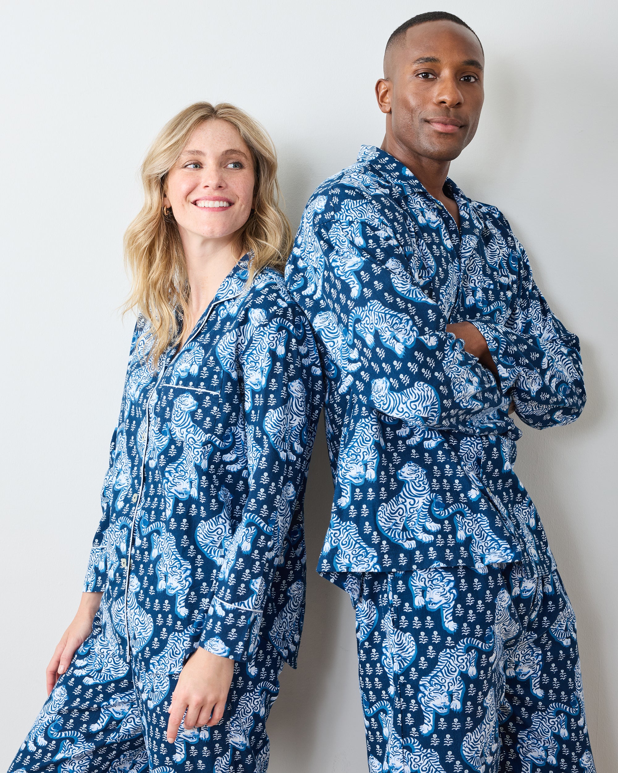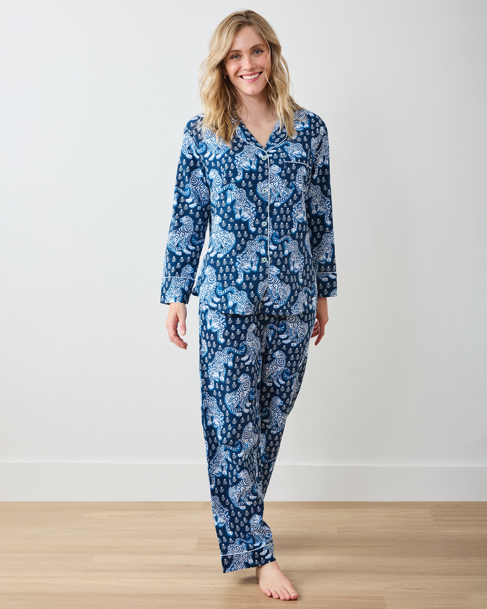 Cozy up to your kingdom with our Tiger Queen flannel PJ set in rich Navy. This pajama set features our fierce feline majesty on lightweight organic flannel. The roomy button-down top and comfortable full-length pants with pockets create the ultimate navy pajama set for year-round lounging. Perfect for nights of fierce style and luxurious comfort. Discover more hand-drawn prints in our and .