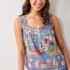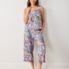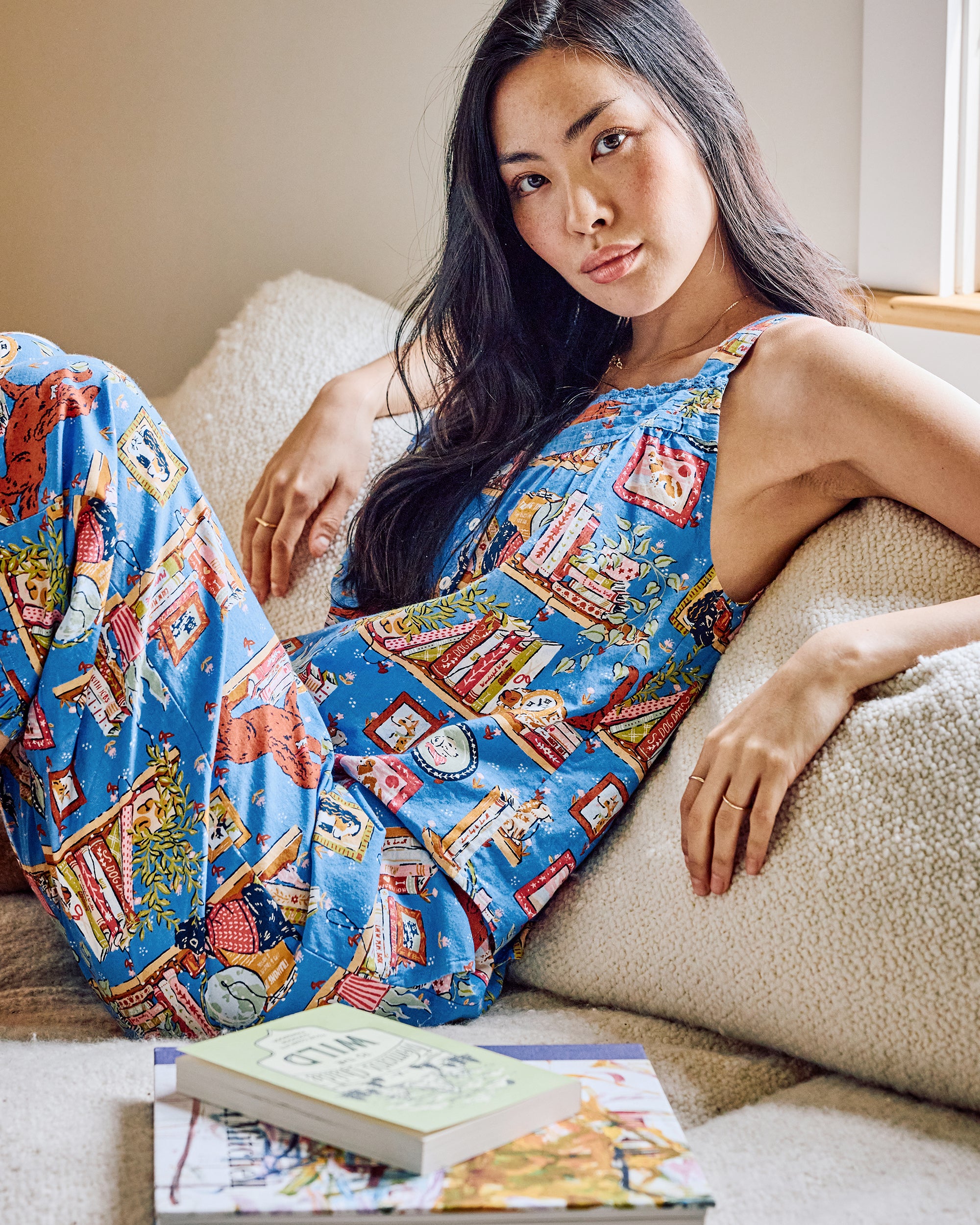 Meet your new reading companion. This cotton pajama set in blue features playful pups lounging among book stacks, in a hand-drawn print on breathable organic cotton. The chic sleeveless top pairs with wide-leg pants featuring a comfortable cropped length and pockets. Perfect dog print sleepwear for book lovers. Explore more cropped pant sets, pajama sets, and pajamas.