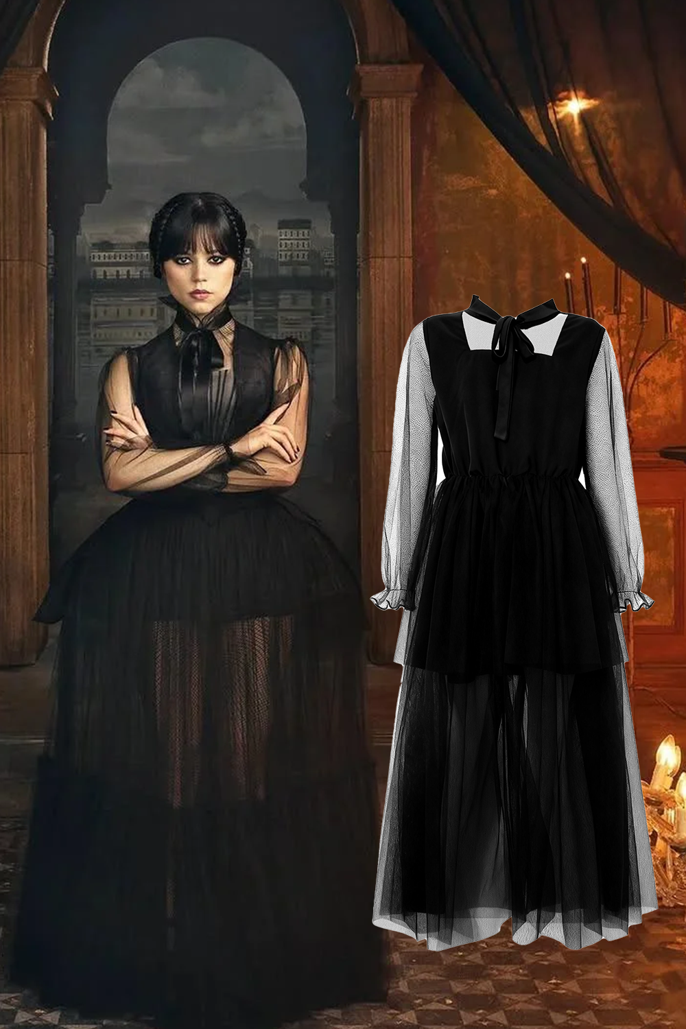 Wednesday’s style encompasses minimal tones, mainly Black in various shades, fabrics and silhouettes. Towards the end of the season we see Wednesday adorned in a maxi Black ruffled dress to prom. If you’re not a fan of all Black clothes, now is the time to divulge into it and explore a different look and if you are, you’re welcome.