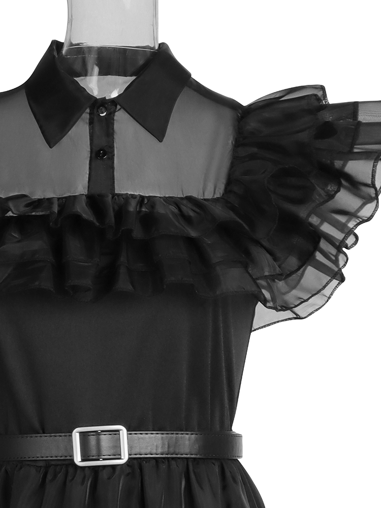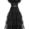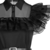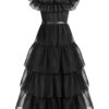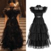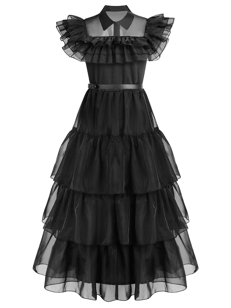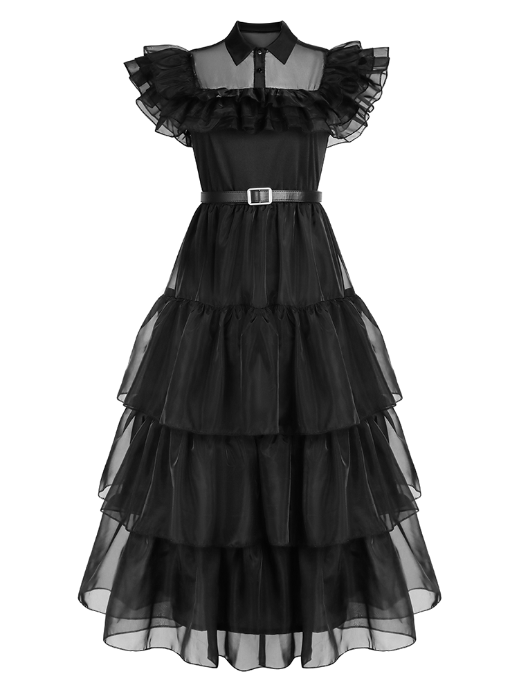 Wednesday’s style encompasses minimal tones, mainly black in various shades, fabrics and silhouettes. Towards the end of the season we see Wednesday adorned in a maxi black ruffled dress to prom. If you’re not a fan of all black clothes, now is the time to divulge into it and explore a different look and if you are, you’re welcome.
