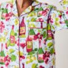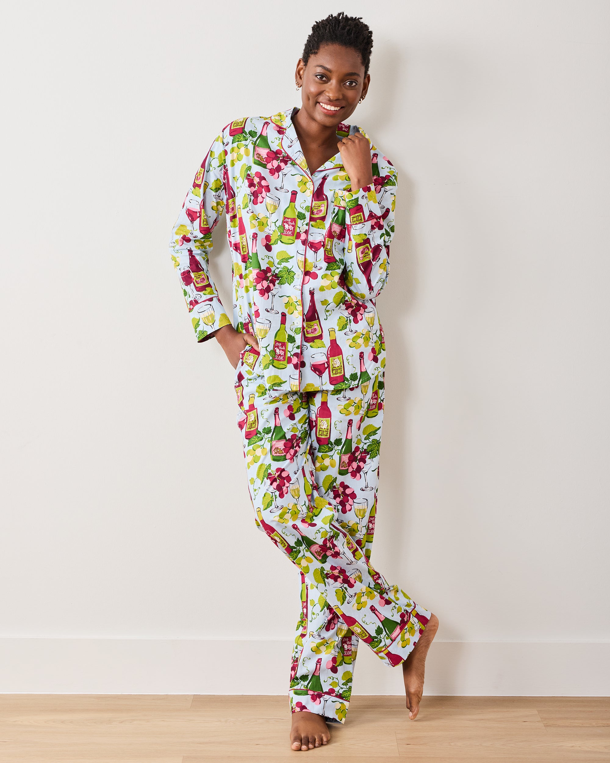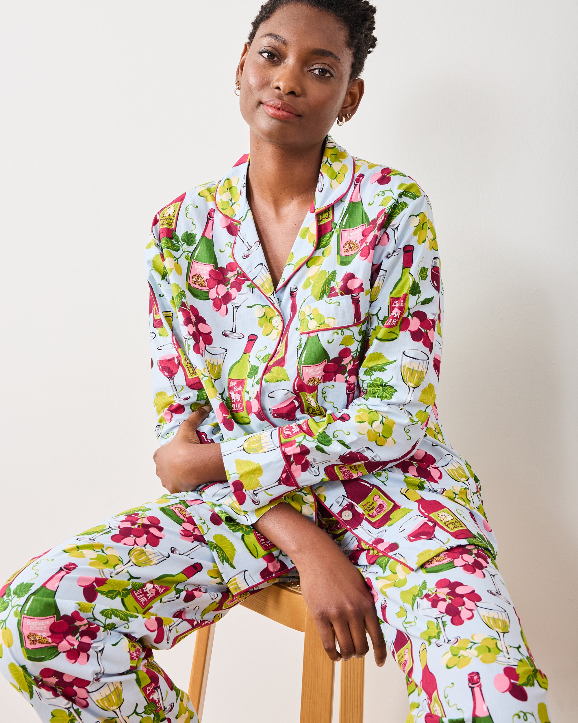 Uncork cozy evenings with our Wine Club long pajama set in rich Vineyard Sky. This cotton sleepwear set features wine bottles adorned with labels inspired by past Printfresh favorites, paired with grape clusters in harvest hues. The relaxed-fit button-down and mid-rise pants with pockets make it the perfect wine print loungewear for fireside evenings or wine-tasting weekends. Explore our and .