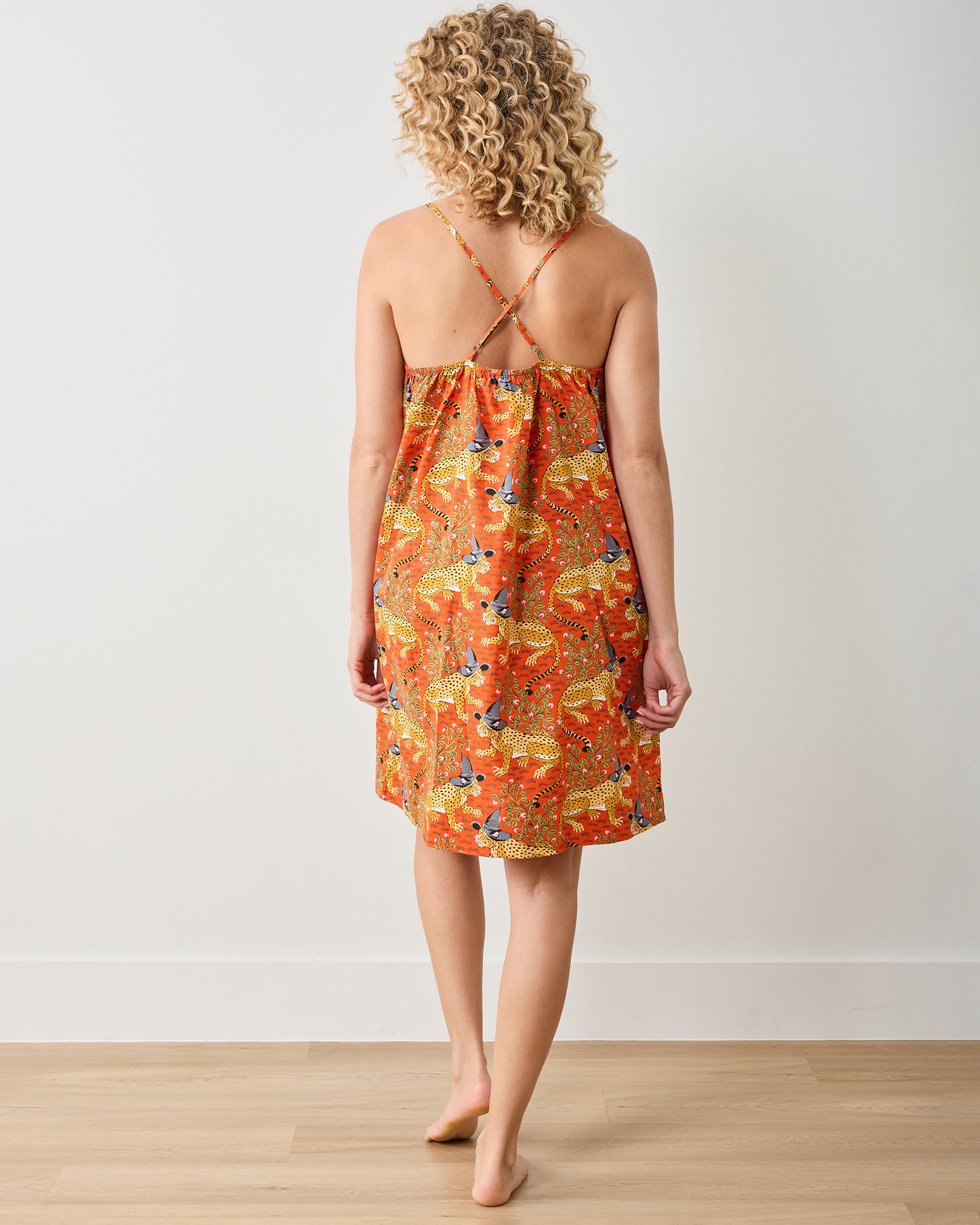 Our beloved Bagheera is dressed up for Halloween in this enchanting cotton nightgown. This leopard print nightgown features our signature jungle cat with moonlit foliage on breathable organic cotton in festive Pumpkin Spice. With a relaxed knee-grazing silhouette, adjustable straps, and gentle stretch in the back, this cotton cami nightdress is both chic and comfortable. Explore more whimsical prints in our and collections.